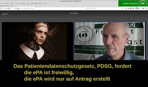 ![]() | Diskussion zum Zwang zur elektronischen Patientenakte | 06.12.25, 09.03.25, 27.04.24 | /images/videos/202304ePA-Diskussion15-29min.mp4 oder https://youtu.be/NOoitGOZqrQ |