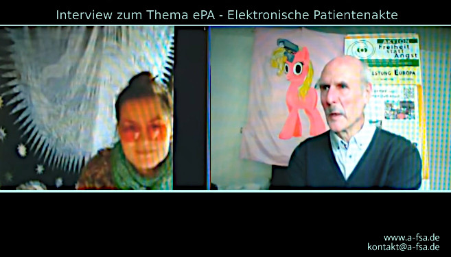 ![]() | Interview zur elektronischen Patientenakte | 26.10.24, 13.07.24, 03.08.24, 03.01.21 | /images/videos/202012Interview-ePA-AlexTV1Mb.mp4 oder https://www.youtu.be/wSYO97h9xwI |