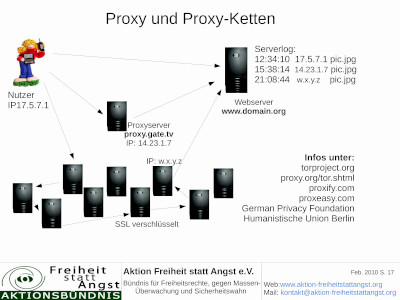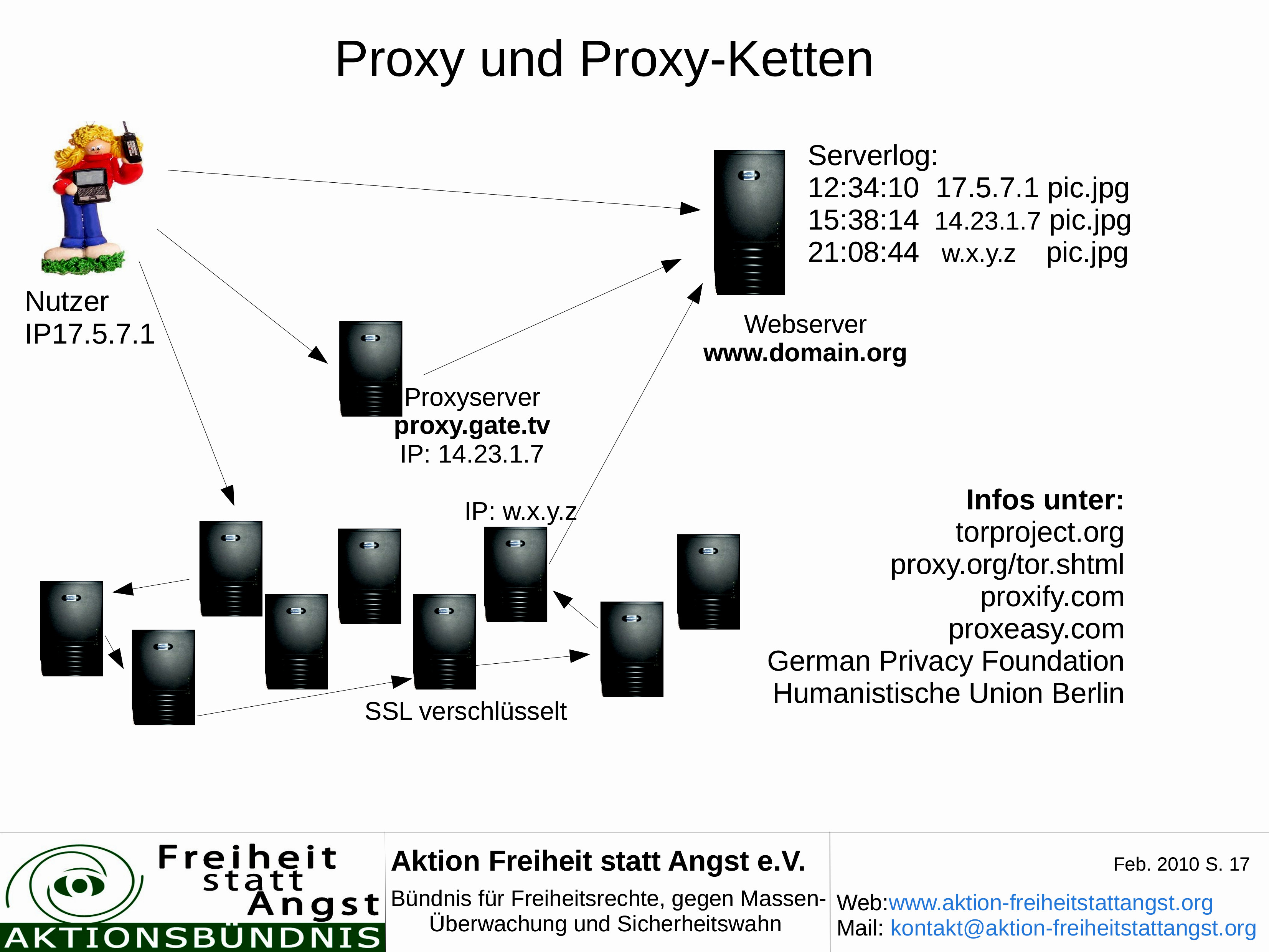 Während normalerweise bei jeder Internetverbindung der Web Server sieht von welcher IP Adresse die Anfrage kommt – das ist der Pfeil ganz oben direkt zum Webserver - die er dann beantwortet, können wir das schon mal sicherer machen, wenn wir einen VPN über einen Proxy-Server nutzen. Dann sieht der Webserver nur die IP Adresse von dem Proxy – und wenn der uns nicht verrät, dann sind wir sicher.