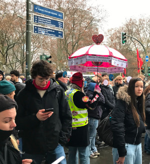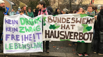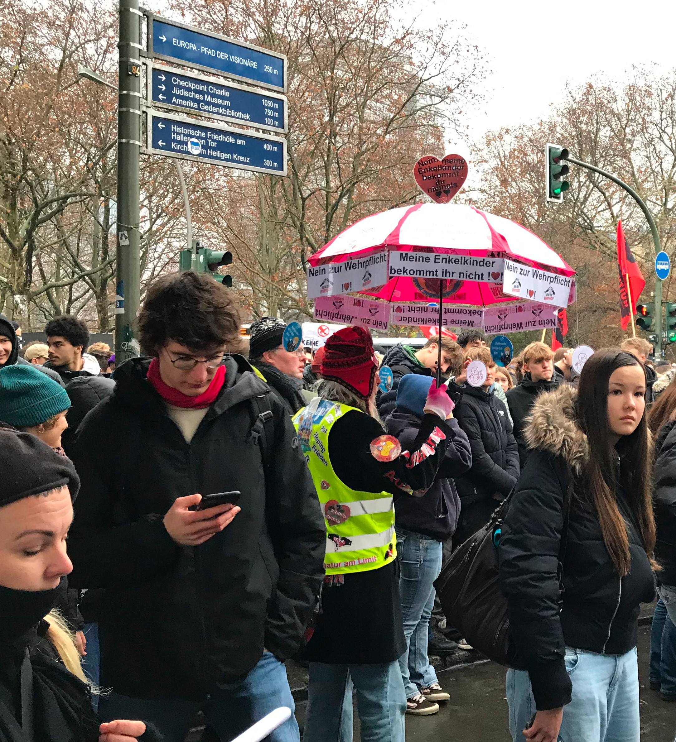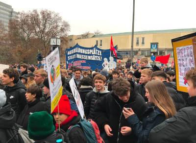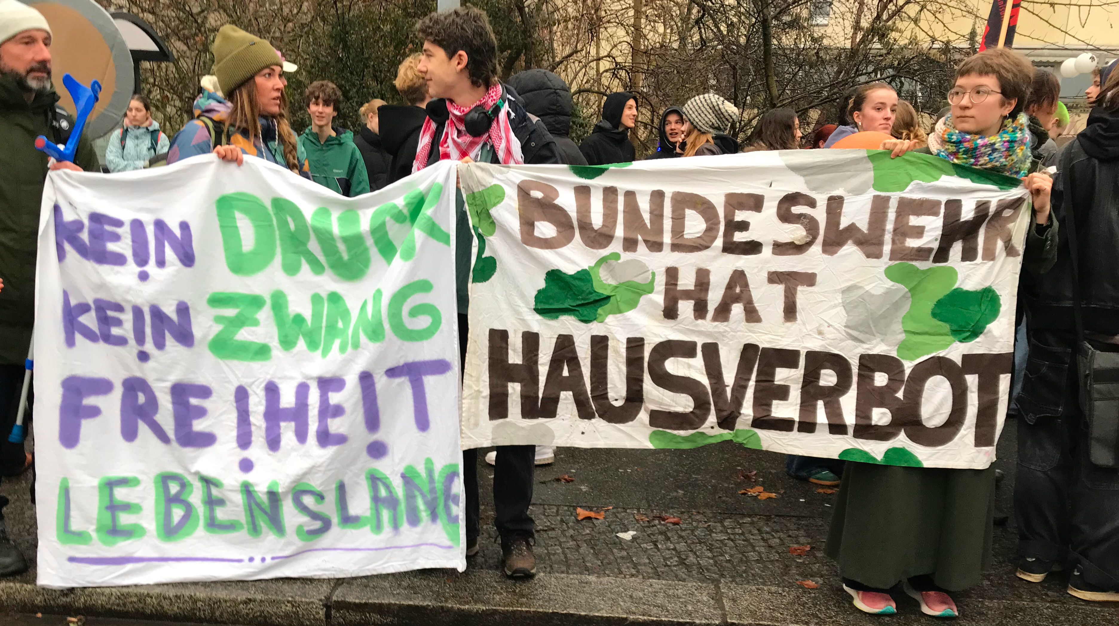 Mehr als 50.000 Schülerinnen und Schüler waren gestern bundesweit in vielen Städten zum 1. Schulstreik gegen die an diesem Tage im Bundestag neu eingeführte Wehrpflicht auf den Beinen. In Berlin hatten die Schülergruppen 1000 Demonstranten angemeldet und sprachen dann am Nachmittag erfreut von 7000 Menschen. Die Polizei sah angeblich nur 3000 Teilnehmer. Aktive von Aktion Freiheit statt Angst waren schon um 12:10 von den Massen überrascht, die sich die Treppen aus den U-Bahnlinien U1 und U6 heraus bewegten. Kurt Tucholskys Worte "Nieder mit der Wehrpflicht! Nie wieder Krieg!" waren auf vielen Flyern zu lesen. Viele Schüler waren besonders empört, dass die Politiker es nicht für nötig gehalten haben, das Gespräch mit ihnen zu suchen. Niemand redet mit uns.