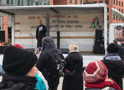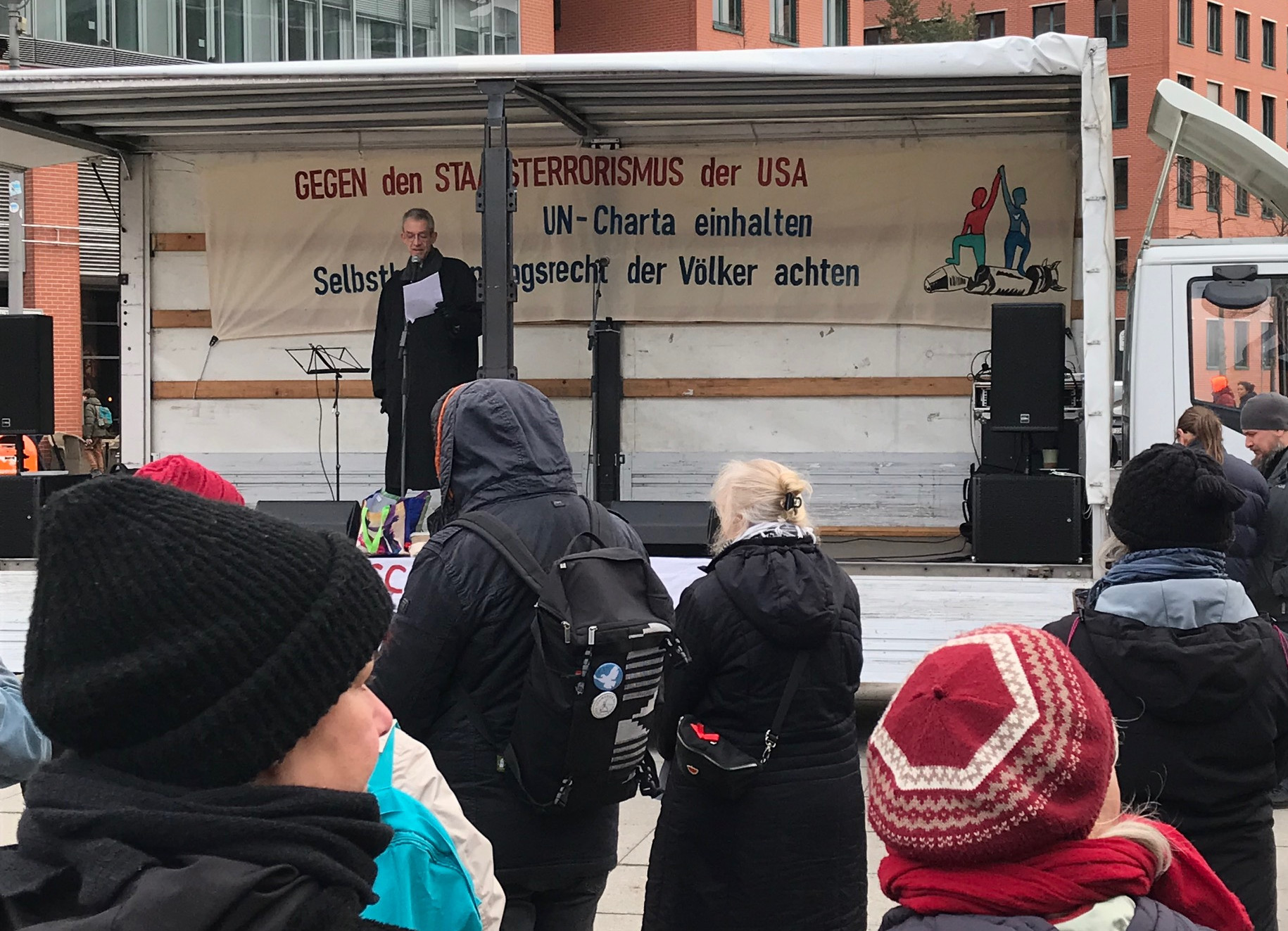 Gegen Kriegstreiberei und Staatsterrorismus der USA Auch anlässlich der Münchner Sicherheitskonferenz fand in Berlin zeitgleich mit der auch von Aktion Freiheit statt Angst e.V. unterstützten Anti-Siko-Demo auf dem Stachus in München, hier auf dem Potsdamer Platz eine Friedenskundgebung statt. Auch unsere Aktiven waren dabei. Weitere Kundgebungen gab es auf dem Gänsemarkt in Hamburg, am Brockhaus-Brunnen auf der Zeil in Frankfurt/M und an der Heiliggeistkirche in Heidelberg. Für die Verwirklichung der UN Charta und das Selbstbestimmungsrecht der Völker - Stoppt den Staatsterrorismus der USAWährend sich die kalten Krieger in München gegenseitig bejubeln geht die Friedensbewegung mit den unter ihren Kriegen leidenden Menschen auf die Straße. Die Außenpolitik der USA, die aus Erpressung, Entführung, Sanktionen, direkten Kriegshandlungen bis hin zum Versuch des Aushungern von sich nicht unterwerfenden Ländern besteht, bedroht nicht nur die Länder Lateinamerikas, allen voran Kuba, sondern darüber hinaus auch ganz aktuell den Iran und Grönland, sowie alle Länder, die sich ihrem Vormachtanspruch nicht beugen wollen. Dagegen stellen sich Friedens- und Solidaritätsbewegung gemeinsam. Weil gerade in München die alljährliche Sicherheitskonferenz tagt, haben wir den 14.2. ausgewählt, in mehreren Städten auf die Straße zu gehen, um gegen diese Hegemonialpolitik der USA, die von der EU und der deutschen Regierung gefördert wird, zu protestieren. Nach dem völkerrechtswidrigen Überfall auf Venezuela - Tötung von mehr als 80 Venezulanern und der Entführung des Präsidenten und seiner Frau - richtet sich jetzt die US Kriegsmaschine gegen Cuba. Das Land unterliegt durch die ebenfalls völkerrechtswidrige Blockade von Ölimporten faktisch einem Stillstand des motorisierten Verkehr und ständigen Stromabschaltungen. Seit Jahren fordert die UN Vollversammlung mit großer Mehrheit - zuletzt bei nur 2 Gegenstimmen (USA und Israel) - die Aufhebung der US Sanktionen. Für das Völkerrecht und die Souveränität der Staaten! NEIN zum Krieg! Mehr dazu bei https://frikoberlin.de/ Kategorie[18]: Pressemitteilungen Short-Link dieser Seite: a-fsa.de/d/3N3 Link zu dieser Seite: https://www.a-fsa.de/de/articles/9440-20260215-nein-zu-euren-kriegen.html Link im Tor-Netzwerk: http://a6pdp5vmmw4zm5tifrc3qo2pyz7mvnk4zzimpesnckvzinubzmioddad.onion/de/articles/9440-20260215-nein-zu-euren-kriegen.html Tags: #AntiSiko #München #Sicherheitskonferenz #Demo #Sanktionen #Staatsterror #USA #Cuba #Venezuela #SchuleohneMilitär #Atomwaffen Erstellt: 2026-02-15 09:16:02 Kommentar abgeben |