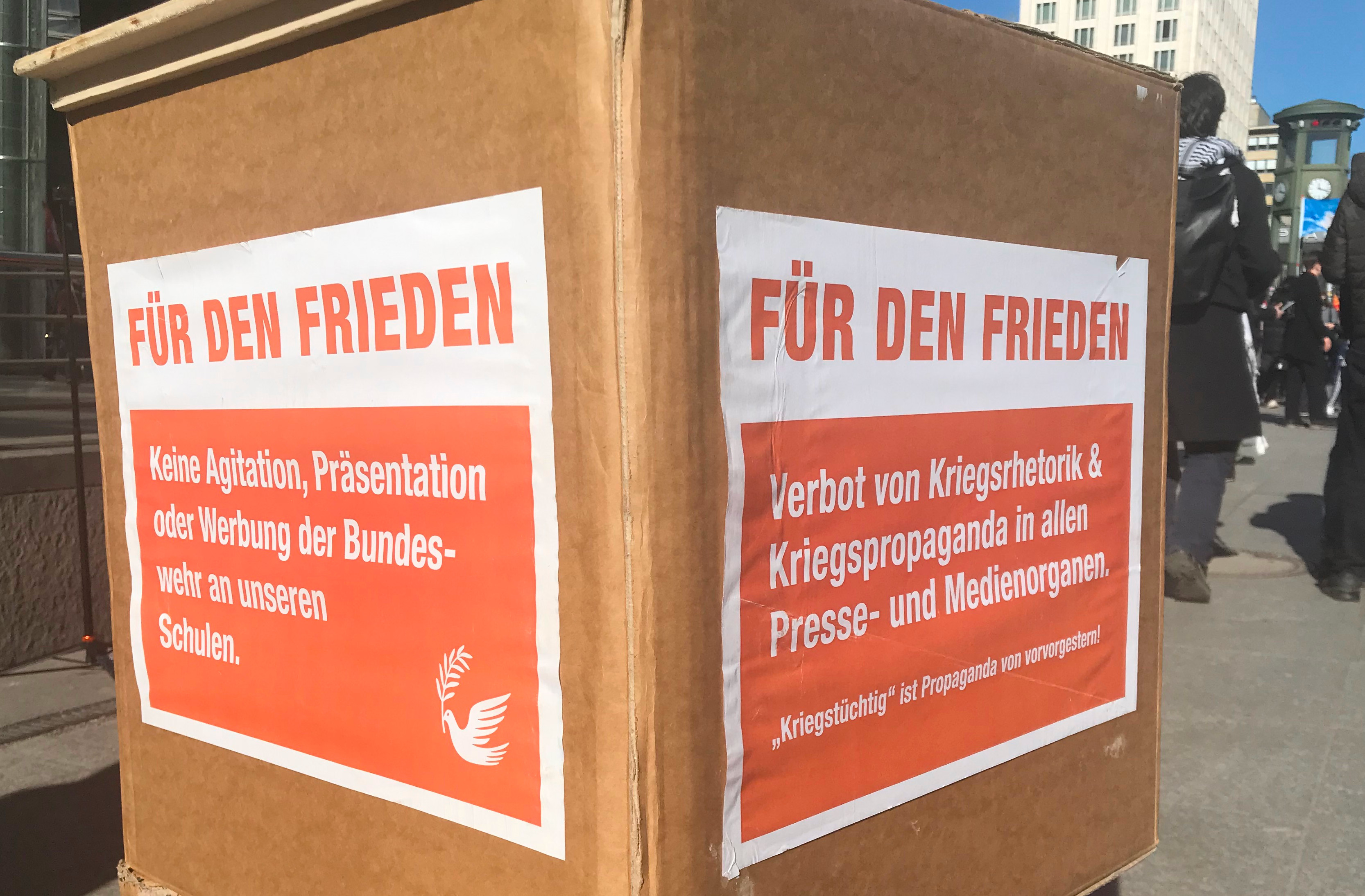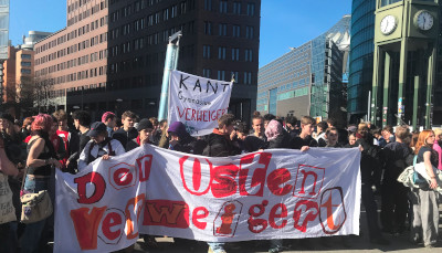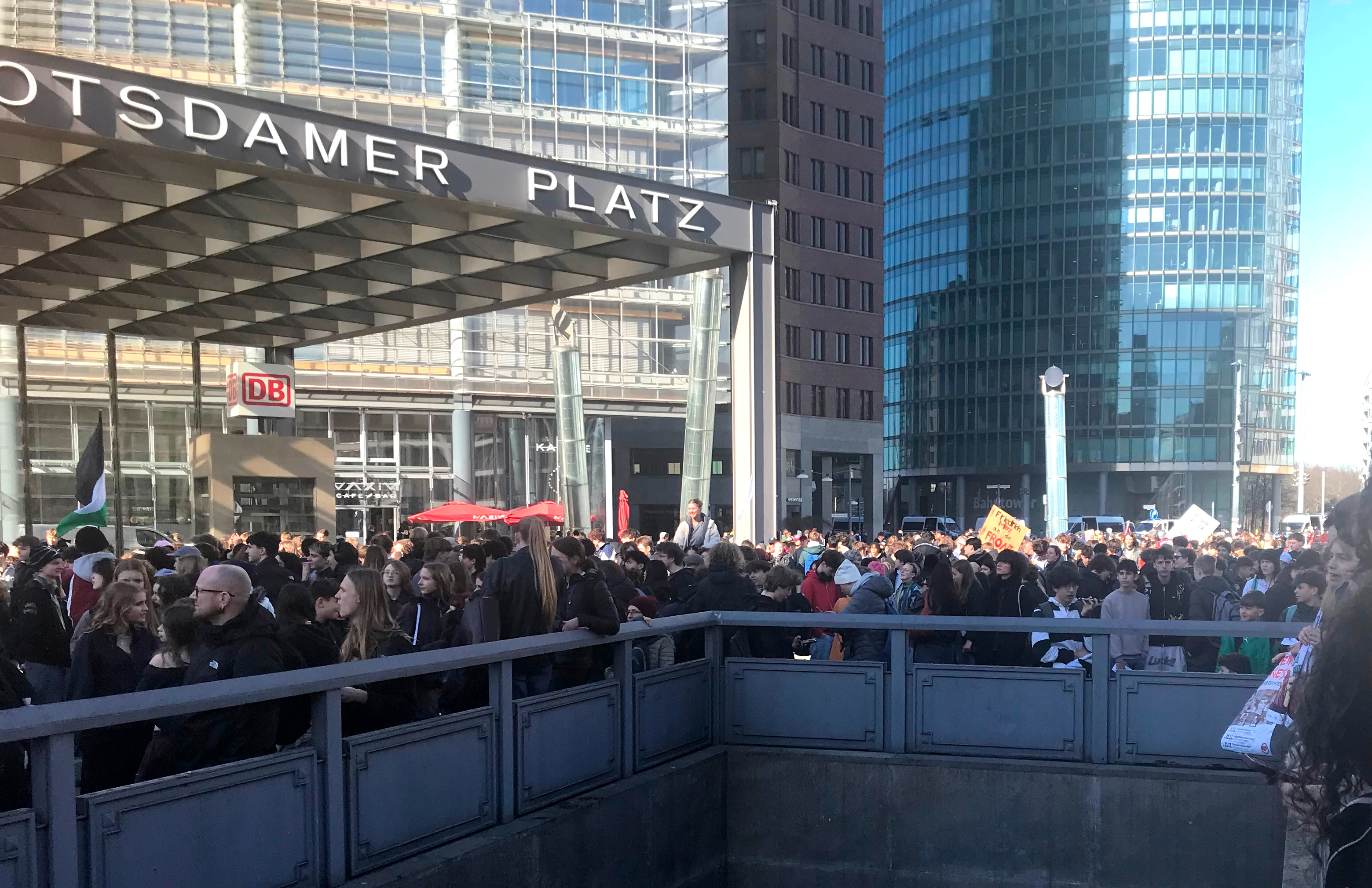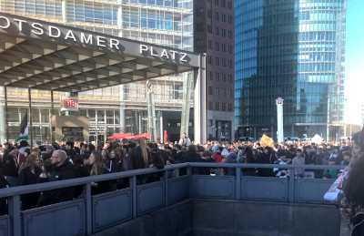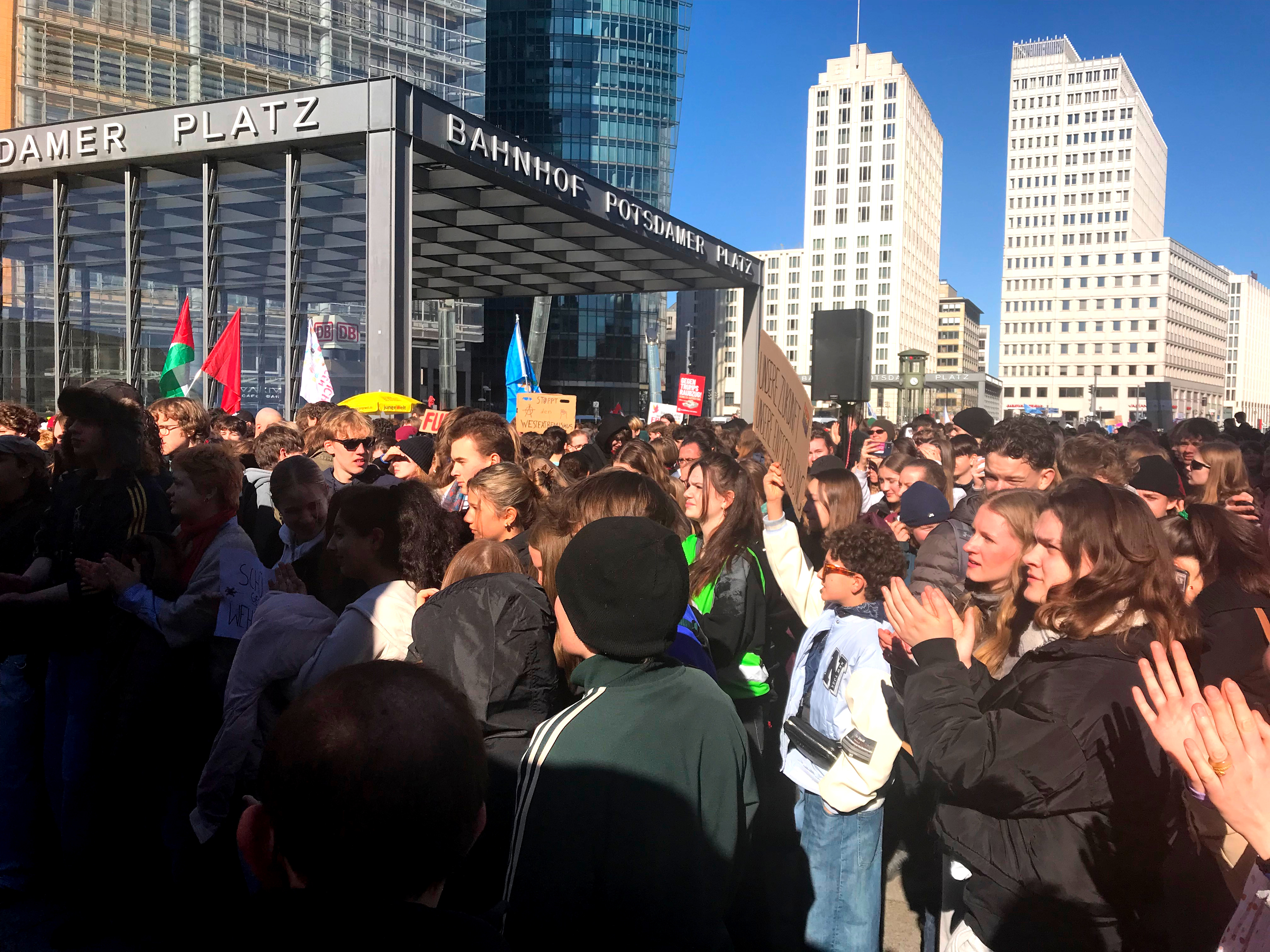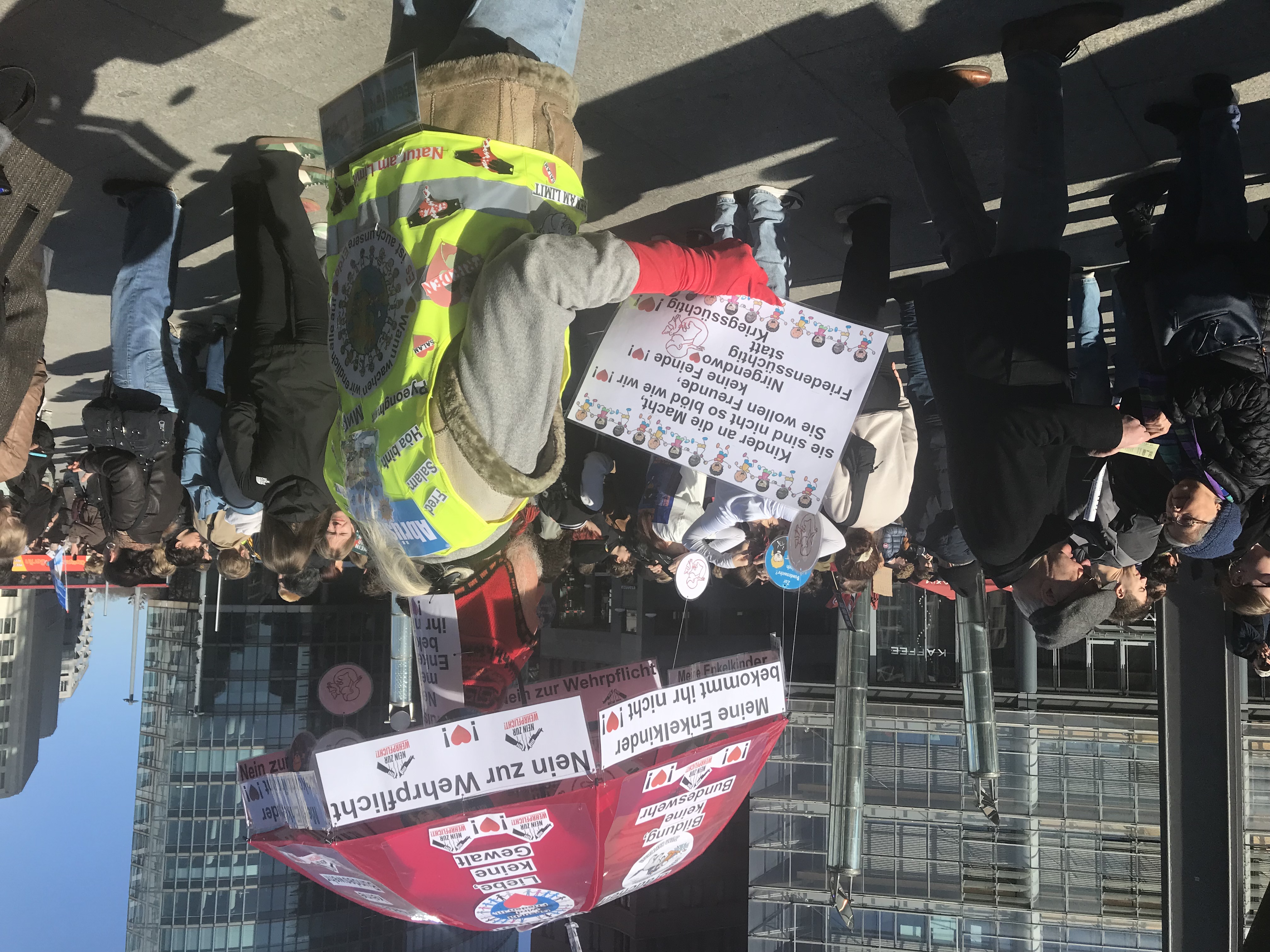 Nach dem 5. Dezember fand gestern der 2. große bundesweite Schulstreik statt. Aktive von Aktion Freiheit statt Angst e.V. waren dabei. Seit 17 Jahren wenden wir uns gegen die Rekrutierung von Kindern und Jugendlichen durch "Karriereberater" der Bundeswehr. Die Geschichte hat uns gezeigt, was die Folgen ungebremster Aufrüstung sind. Aus dieser Erkenntnis haben wir über Jahre im Berliner Bündnis "Schule ohne Militär" mitgearbeitet. Waren am 5. Dezember letzten Jahres bundesweit bereits über 55.000 bei den Demos dabei, so war auch der gestrige Tag ein Erfolg, denn die Veranstalter sehen diese Zahl auch für den gestrigen Tag. Der Potsdamer Platz in Berlin war jedenfalls bereits 10 Minuten nach dem offiziellen Start der Kundgebung um 11h gut gefüllt. Das lag auch daran, dass einige Schulen "Zubringerdemos" angemeldet hatten, die pünktlich am Startpunkt der großen Demo eintrafen. In den Reden artikulierten die SchülerInnen ihre Ablehnung der Regierungspolitik stellten Forderungen auf. Grundsätzlich stellten sie die Zwangserfassung aller 18-Jährigen durch das neue Gesetz vom Dezember 2025 in Frage. Dazu stellte die AG "Rührt euch" gegen jedes Militär&Patriarchat fest: