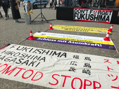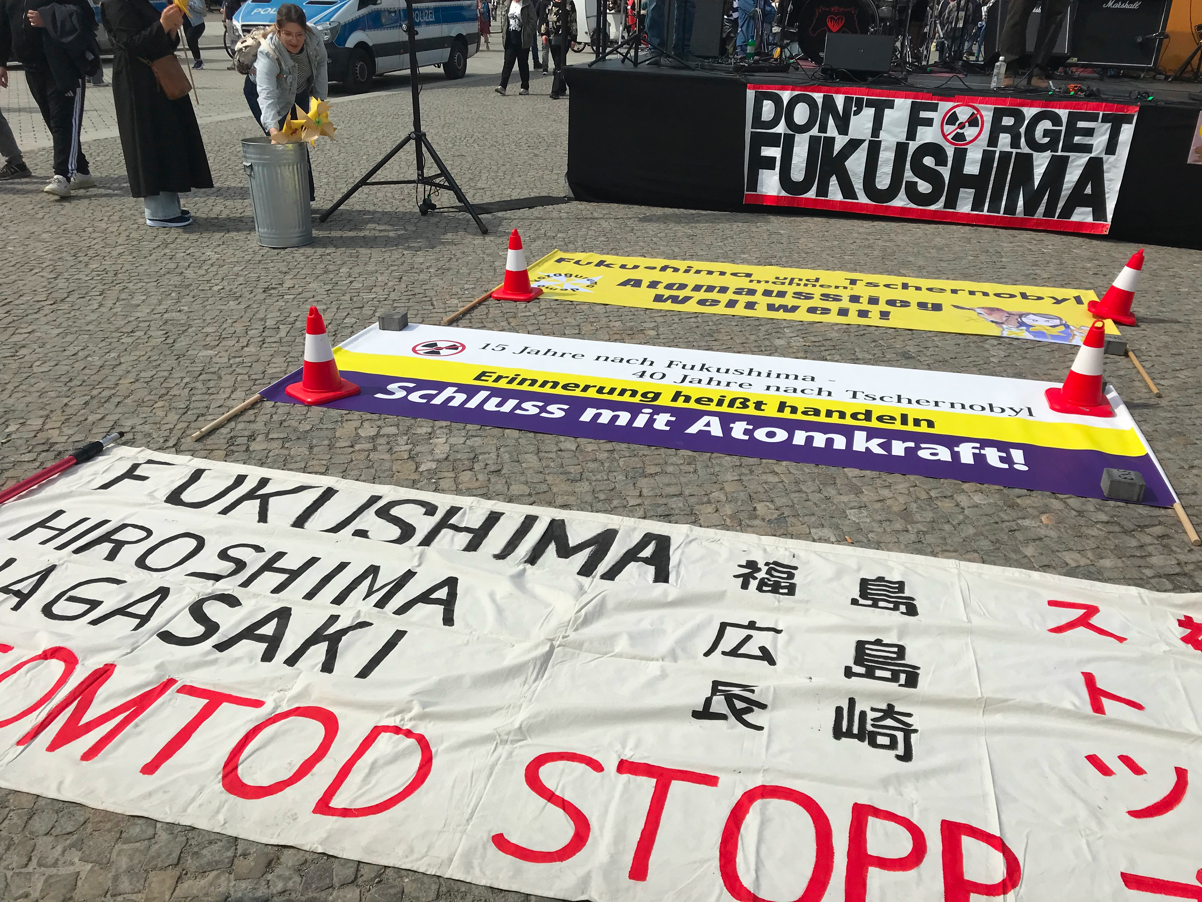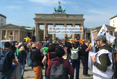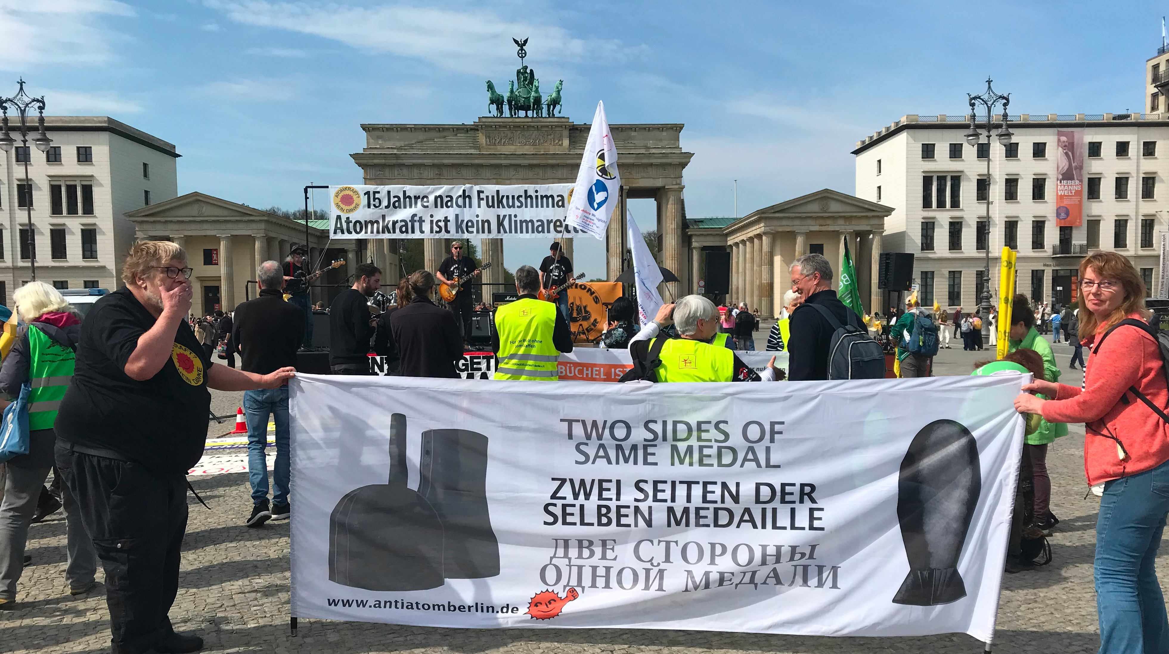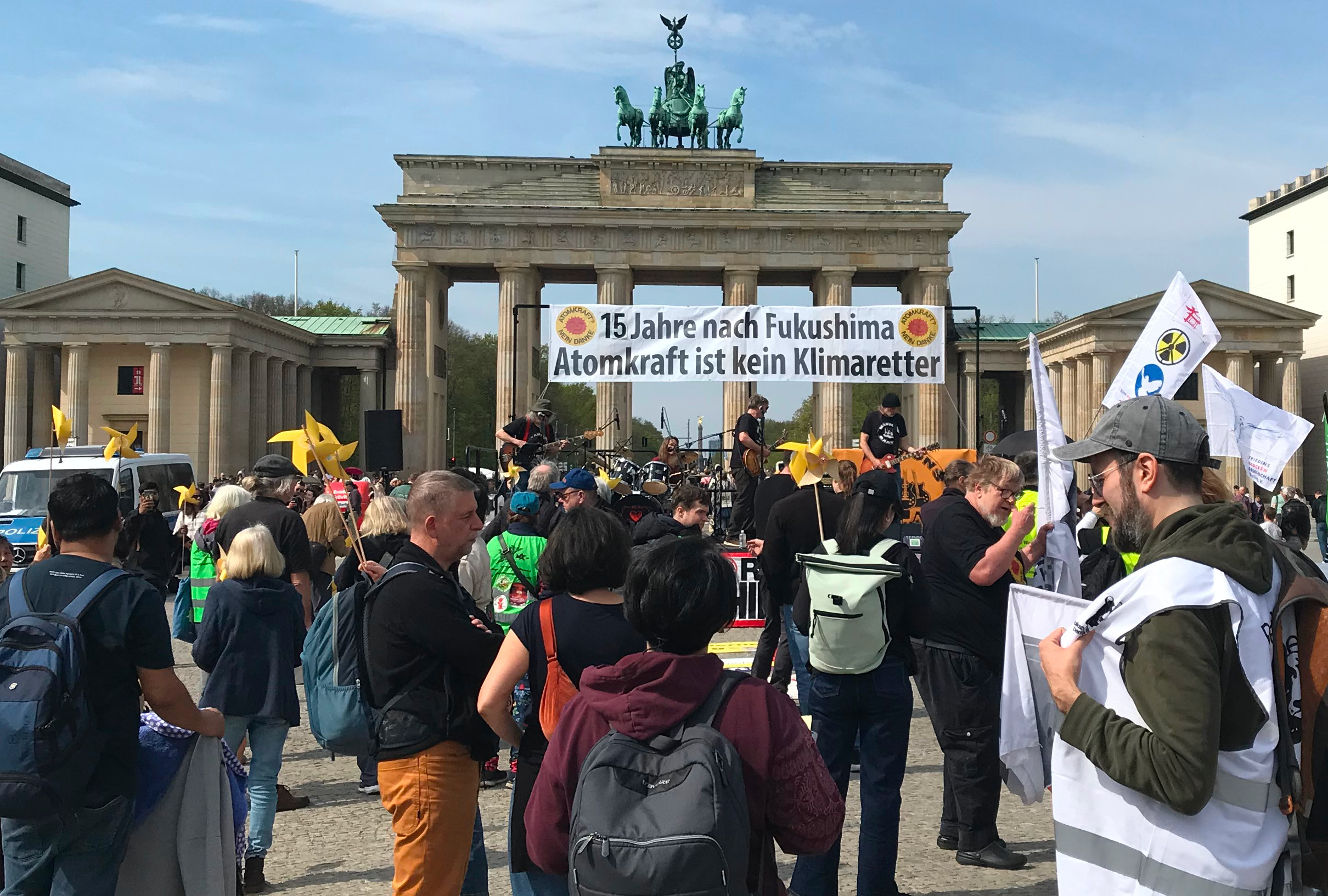 Deshalb haben wir auch zum 15. Jahrestag von Fukushima und zum 40. Jahrestag von Tschernobyl die gemeinsame Aktion der Anti-Atom-Bewegung am 18. April 2026 am Brandenburger Tor besucht. In den Reden wurden die aktuellen Themen angesprochen:
